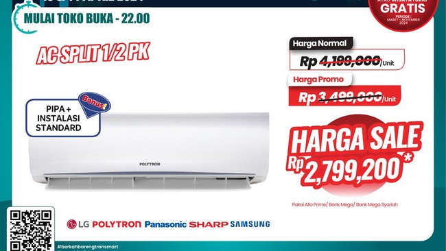 Pada Transmart Full Day Sale, AC Split 1/2 PK ditawarkan mulai dari Rp 3.499.000 dari harga awal Rp 4.199.000. Harganya makin murah menggunakan Allo Prime, Allo Paylater, Kartu Kredit Bank Mega atau Bank Mega Syariah, yaitu menjadi hanya Rp 2.799.200.