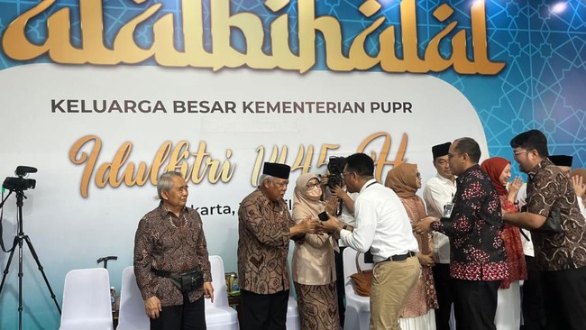 Menteri Pekerjaan Umum dan Perumahan Rakyat (PUPR) Basuki Hadimuljono menyelenggarakan halalbihalal di Kantor Kementerian PUPR pada hari ini, Selasa (16/4/2024). Dalam momentum tersebut sang istri, Kartika Nurani, turut serta mendampinginya.