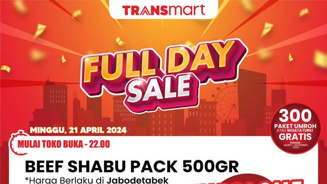 Di Transmart Full Day Sale Jabodetabek, beef shabu pack 500 gram diobral dari harga normal Rp 99.000 menjadi Rp 79.200. Diskon ini bisa didapatkan jika transaksi menggunakan Allo Prime, kartu kredit Bank Mega atau Bank Mega Syariah.