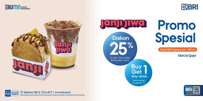 Promo spesial BRI di Janji Jiwa ini berlaku untuk kamu nasabah Debit BRI Mastercard dan QRIS di BRImo. Promo tidak dapat digabung dengan promo lainnya dan tidak berlaku kelipatan.