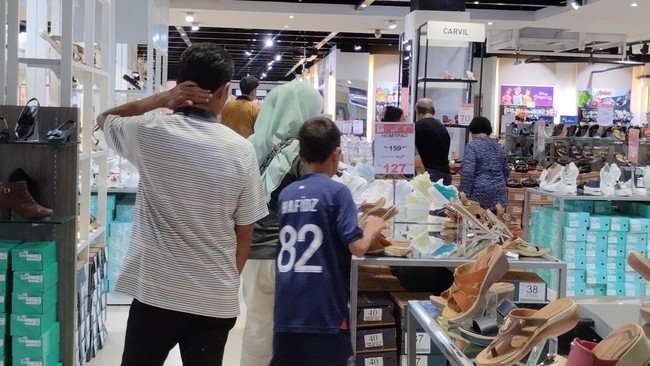 Berdasarkan pantauan detikcom, Minggu (26/4/2024), pembeli mulai menyerbu area sepatu dan sandal di Transmart Cempaka Putih. Mereka melihat-lihat produk yang dipajang dan mencoba produk yang diminatinya.