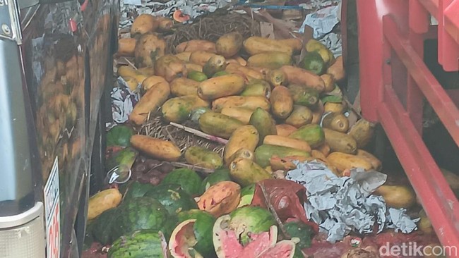 "Banyak sih (pedagang yang buang pepaya karena busuk) itu, ada yang sampai tiga truk itu. Satu truk itu sekitar 8 ton, jadi berapa tuh yang dibuang? Sehari itu, satu lapak ada yang membuang segitu (24 ton pepaya)," kata Fasita.