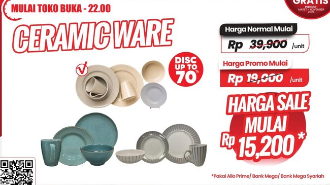 Salah satu produk yang dijual dengan harga miring adalah set piring dan gelas keramik dengan harga promo mulai dari Rp 19.000/unit. Padahal harga normalnya mulai dari Rp 39.900/unit.