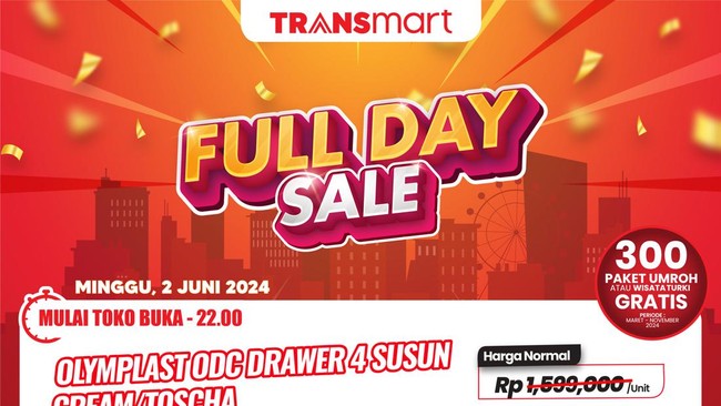 Jadi tunggu apa lagi? Segera merapat ke Transmart terdekat, lalu nikmati diskon melimpah khusus di Transmart Full Day Sale.