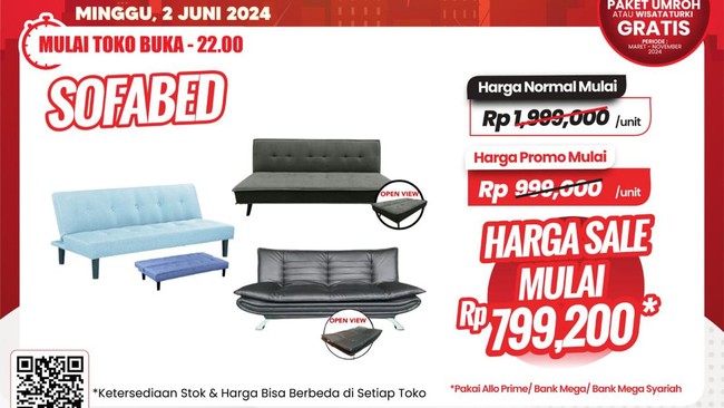 Bagi Anda yang sedang cari perlengkapan rumah tangga, kebetulan Transmart menawarkan harga spesial. Khusus hari ini, pelanggan bisa mendapatkan produk Sofa Bed dengan harga diskon Rp 999.000 untuk satu unit dari harga normal Rp 1.999.000.