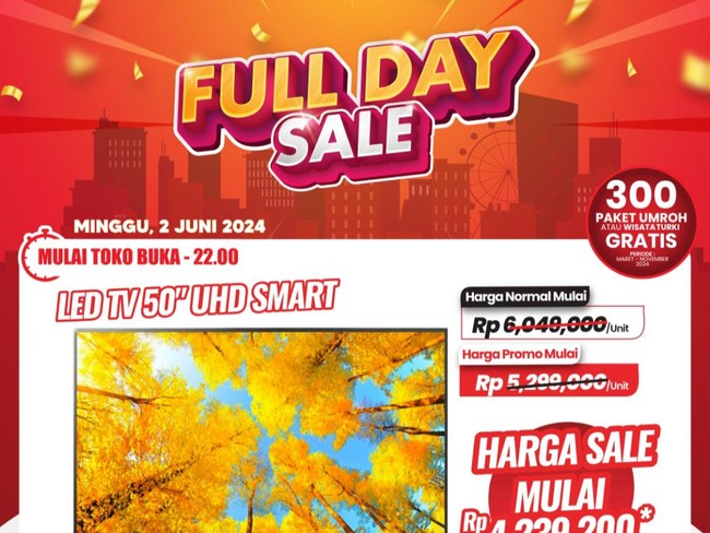 Adapun TV LED ukuran 50 inch berbagai merek dibanderol mulai dengan harga Rp 5.299.000 dari harga awal Rp 6.049.000. Harganya jadi lebih murah lagi jika bertransaksi menggunakan Allo Prime, Kartu Kredit Bank Mega atau Bank Mega Syariah, harganya menjadi Rp 4.239.200. Alhasil, pelanggan bisa hemat dengan total Rp 1,8 jutaan.