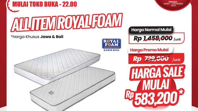 Selanjutnya, All Item Royal Foam ditawarkan dengan harga promo mulai dari Rp 729.000 dari harga normal mulai dari Rp 1.458.000. Pelanggan bisa mendapatkan kasur ini dengan harga sale mulai dari Rp 583.200. Harga ini berlaku untuk Jawa dan Bali.