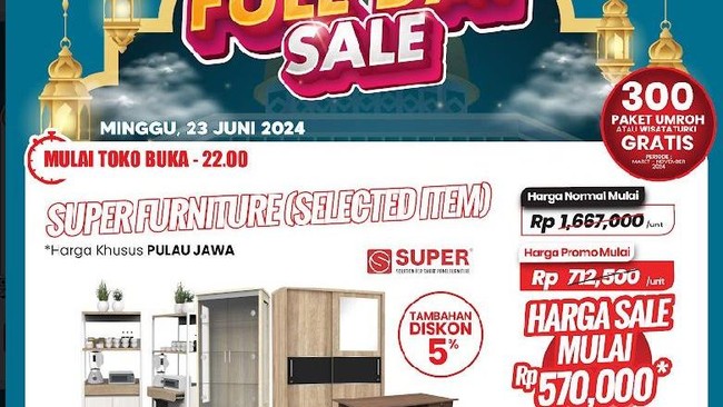 Di Transmart Full Day Sale, produk Super Furniture untuk pembelian di wilayah Pulau Jawa ditawarkan dengan harga promo mulai Rp 712.500/unit. Padahal harga normalnya mulai Rp 1.667.000/unit.