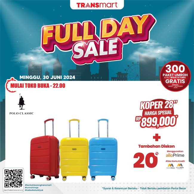 Selain koper, dalam periode Transmart Full Day Sale juga ada banyak penawaran diskon menarik hingga 50%+20% untuk produk-produk lainnya seperti sembako, produk rumah tangga, furnitur, kosmetik, hingga fesyen.