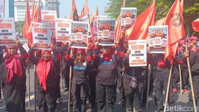 "Ketiga adalah karyawan kontrak yang tanpa periode yang akhirnya juga menuju kepada outsourcing seumur hidup atau karyawan kontrak seumur hidup. Keempat adalah berkenaan dengan outsourcing seumur hidup. Kelima berkenaan dengan PHK yang dipermudah," ucapnya sambil menjelaskan tuntutan yang lain.