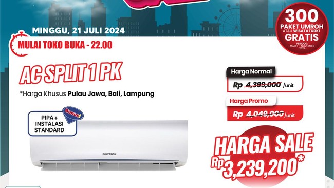 Selama gelaran Transmart Full Day Sale ini, sejumlah produk dijual dengan harga spesial mulai toko buka hingga berahir jam 10 malam. Salah satunya produk AC Split 1 PK dari merk LG, Polytron, Panasonic, SHARP, hingga Samsung.