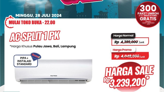Produk itu adalah AC 1 PK dari berbagai merek. Di Pulau Jawa, Bali, dan Lampung, produk itu ditawarkan dengan harga promo Rp 4.049.000/unit dari harga normal Rp 4.399.000/unit.