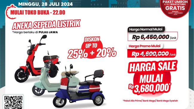 Salah satunya adalah sepeda listrik dari berbagai merek. Di Pulau Jawa, Transmart memberikan diskon sampai 25% plus 20% untuk produk tersebut. Harga promonya Rp 4.600.000/unit dari harga normal Rp 6.450.000/unit. Sementara jika menggunakan Allo Prime, Allo Paylater, kartu kredit Bank Mega atau Bank Mega Syariah maka pelanggan bisa mendapatkan barang tersebut mulai dari Rp 3.680.000. Ini berarti pelanggan bisa setia hemat Rp 2.770.000 dari harga normal.