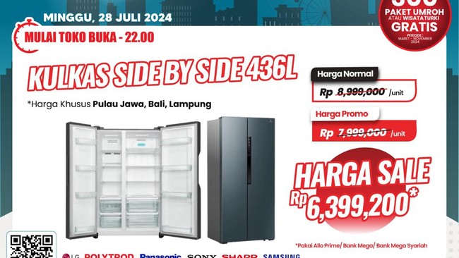 Jika menggunakan Allo Prime, Allo Paylater, dan kartu kredit Bank Mega atau Bank Mega Syariah, maka pelanggan bisa membawa pulang kulkas tersebut dengan harga Rp 6.839.200. Dengan begitu, pelanggan bisa hemat hingga Rp 2.659.800. Adapun Harga ini berlaku untuk luar Pulau Jawa, Bali, dan Lampung.