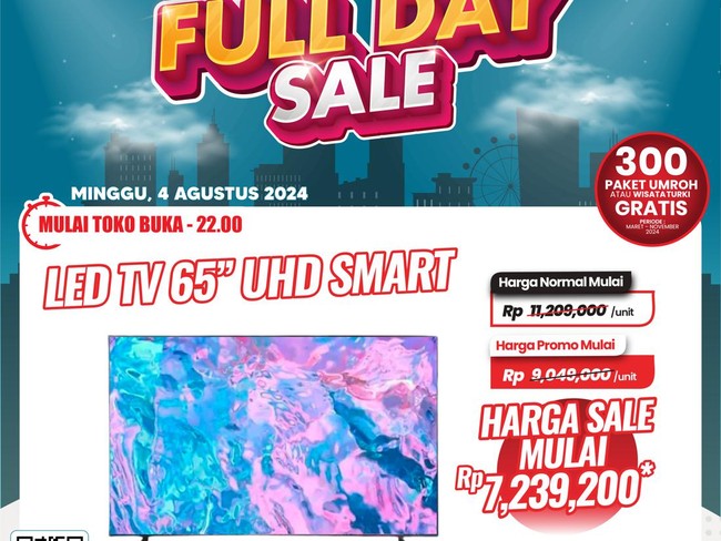 Beragam promo dihadirkan untuk pembelian produk sehari-hari hingga barang elektronik. Salah satu produk yang dapat diskon jumbo adalah TV LED 65" UHD Smart TV dari berbagai merek. Harga normal TV tersebut mulai dari Rp 11.209.000. Khusus pada gelaran kali ini, produk tersebut promo menjadi mulai dari Rp 9.049.000.