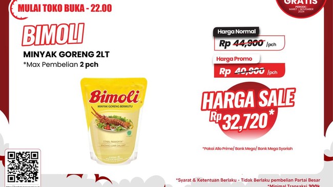 Spesial hari ini, Minggu (11/8/2024) ada tambahan diskon 20% bagi pengguna Allo Bank, kartu kredit Bank Mega dan kartu kredit Bank Mega Syariah. Salah satu produk yang ditawarkan dengan harga murah meriah adalah minyak goreng. Minyak goreng Bimoli 2 liter ditawarkan dengan harga Promo Rp 40.900 dari harga normal Rp 44.900. Harganya makin murah menggunakan Allo Prime, Kartu Kredit Bank Mega atau Bank Mega Syariah, hanya Rp 32.720.