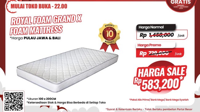 Kasur keluaran Royal Foam Grand X Foam Matters dibanderol dengan harga Rp 729.000 dari harga Rp 1.458.000. Dengan menggunakan kartu kredit Bank Mega atau Bank Mega Syariah, Allo Prime, harganya jadi makin miring Rp 583.200. Alhasil, pelanggan bisa hemat dengan total Rp 870 ribuan.