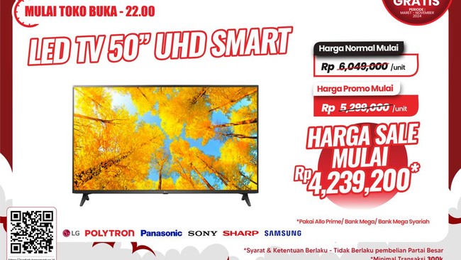 Salah satu barang elektronik yang mendapatkan diskon adalah LED TV. Di antaranya TV LED ukuran 50 inch berbagai merek ditawarkan mulai dengan harga Rp 5.299.000 dari harga biasanya Rp 6.049.000.