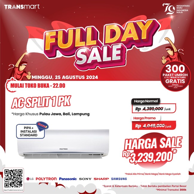 Salah satunya adalah AC 1 PK dari berbagai merek. Di pulau Jawa, Bali, dan Lampung produk itu ditawarkan dengan harga promo Rp 4.049.000/unit dari harga normal Rp 4.399.000/unit. Jika menggunakan Allo Prime, Allo Paylater, dan kartu kredit Bank Mega atau Bank Mega Syariah, pelanggan setia Transmart pun bisa membawa pulang AC tersebut dengan harga Rp 3.239.200/unit. Pelanggan setia bisa untung Rp 1,159,800 jika memaksimalkan promo tersebut.