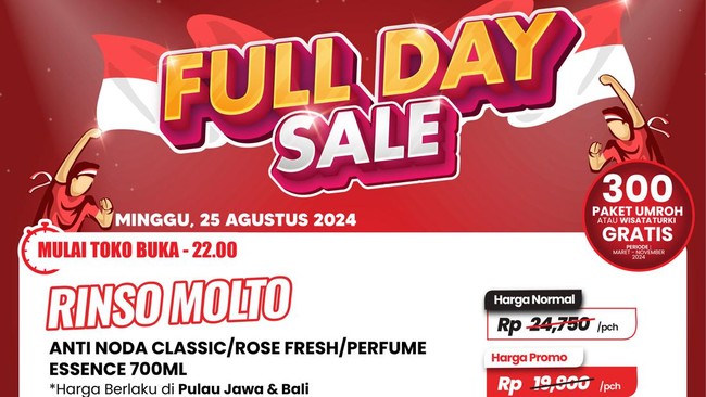 Berbagai macam produk dijual dengan harga spesial, termasuk produk sabun cuci. Khusus hari ini, Rinso Molto Anti Noda Classic, Rose Fresh hingga Perfume Essence 700 ML dijual dengan harga promo Rp 19.000 dari harga normal Rp 24.750.