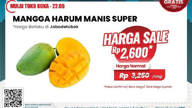 Salah satu produk yang ditawarkan dengan harga spesial adalah mangga harum manis super. Buah tersebut dijual dengan harga sale Rp 2.600/100 gr di Jabodetabek dari harga normal Rp 3.250/100 gr.