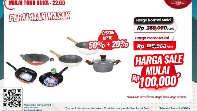 Selain perlengkapan masak, masih banyak diskon untuk produk-produk lainnya seperti sembako, produk elektronik, hingga koper. Jangan lupa pembayaran menggunakan Allo Prime, kartu kredit Bank Mega atau Bank Mega Syariah biar dapat tambahan diskon 20%.