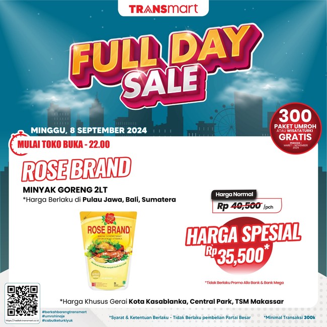 Transmart Full Day Sale sendiri hanya berlaku dari toko buka sampai pukul 22.00 malam. Selain produk tersebut, dalam periode promo ini Transmart juga menawarkan diskon menarik hingga 50+20% untuk produk-produk lainnya mulai dari sembako, produk rumah tangga, elektronik, kosmetik, hingga fesyen. Tentunya tambahan 20% bisa didapatkan dengan Allo Prime, Allo Paylater, Kartu Kredit Bank Mega dan Bank Mega Syariah.