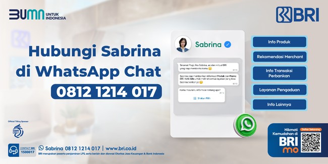 Kamu bisa langsung chat Sabrina untuk mengetahui info lokasi titik merchant BRI terdekat melalui WhatsApp di nomor 0812 1214 017. Ketik kata kunci yang kamu butuhkan, contohnya mencari informasi restoran dengan ketik 'Lapar' atau cari hotel nyaman dengan ketik 'Staycation'. Kirim lokasi terkini dengan fitur 'share location', lalu Sabrina akan memberikan informasi mengenai segala hal yang kamu butuhkan.