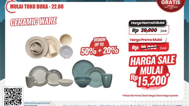 Khusus selama gelaran Transmart Full Day Sale, Ceramic Ware dibanderol dengan harga promo mulai dari Rp 19.000/unit. Padahal harga normalnya dimulai dari Rp 39.900/unit.