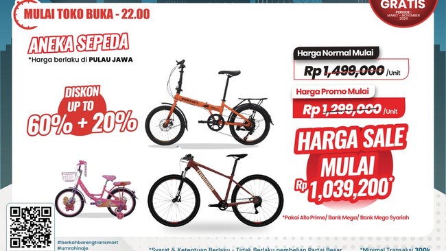 Spesial di hari ini, produk aneka sepeda diskon gede-gedean hingga 60+20%. Produk aneka sepeda dibanderol dengan harga promo mulai dari Rp 1.299.000 dari harga normalnya mulai dari Rp 1.499.000. Harga ini berlaku khusus di Pulau Jawa.
