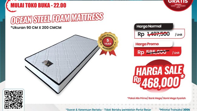 Kasur keluaran Ocean Steel Foam Mattress dibanderol dengan harga Rp 585.000 dari harga Rp 1.497.500. Dengan menggunakan kartu kredit Bank Mega atau Bank Mega Syariah, Allo Prime, harganya jadi makin miring Rp 468.000. Alhasil, pelanggan bisa hemat dengan total Rp 1 jutaan.