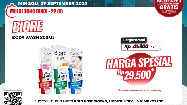 Untuk pembersih, ada Soklin Softergent 770 gr all variant ditawarkan dengan harga Promo mulai dari Rp 16.300 dari harga awal Rp 23.200. Lalu Biore body wash 800 ML all variant ditawarkan dengan harga promo mulai dari Rp 26.800 dari harga awal Rp 41.900.