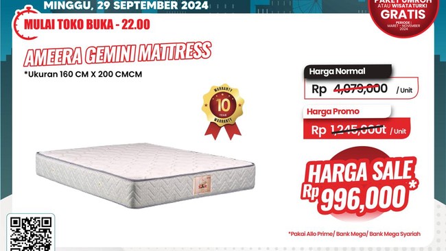 Khusus hari ini di Transmart Full Day Sale, Ameera Gemini Mattress ukuran 160x200 cm berlaku harga promo Rp 1.245.000/unit. Padahal harga normalnya Rp 4.079.000/unit.