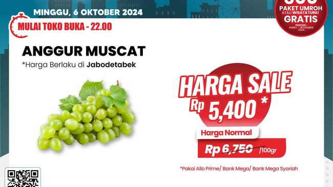 Di Transmart daerah Jabodetabek, anggur muscat didiskon menjadi cuma Rp 5.400/100 gr dari harga normalnya Rp 6.750/100 gr. Harga spesial ini bisa didapatkan jika transaksi menggunakan Allo Prime, kartu kredit Bank Mega atau Bank Mega Syariah.