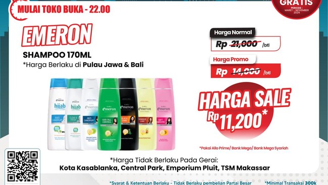 Lalu, untuk sampo Emeron 170 mililiter, normalnya Rp 31.000/botol, sementara harga promo Rp 14.000/botol. Harga bisa lebih murah lagi dengan metode di atas menjadi Rp 11.200/botol.
