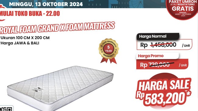 Untuk ukuran yang lebih kecil, ada Royal Foam Grand X Foam Mattress ukuran 100x200 cm dengan harga promo Rp 729.000/unit dari harga normal Rp 1.450.000/unit. Bisa dibawa pulang dengan harga Rp 583.200 jika pembayaran menggunakan Allo Prime, kartu kredit Bank Mega atau Bank Mega Syariah.