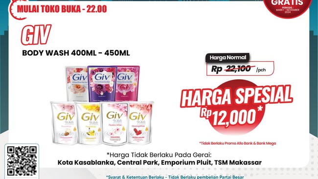 Harga sabun mandi cair merek Giv 400-450 ml normalnya Rp 22.100/pouch, sementara harga promo Rp 12.000/pouch. Pelanggan bisa mendapatkan harga lebih murah lagi yakni Rp 10.100/pouch.