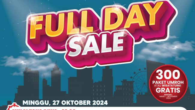 Transmart Full Day Sale digelar dari buka toko hingga pukul 22.00. Di Full Day Sale, Transmart memberikan diskon hingga 50% untuk berbagai produk. Ada diskon tambahan 20% jika pelanggan transaksi menggunakan Allo Prime, Allo Paylater, kartu kredit Bank Mega atau Bank Mega Syariah.