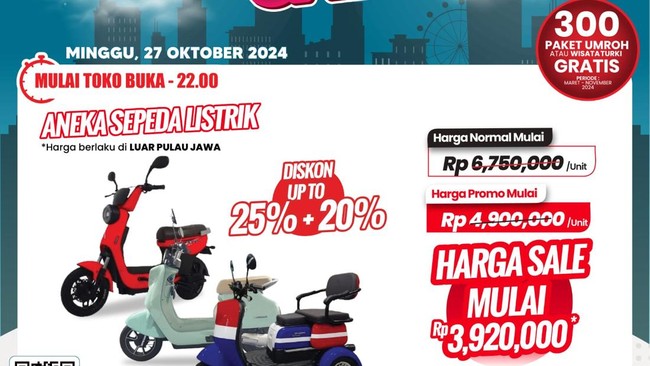 Khusus luar Jawa, sepeda listrik ditawarkan dengan harga promo Rp 4.900.000 dari harga normal Rp 6.750.000. Kemudian, sepeda tersebut ditawarkan dengan harga sale mulai dari Rp 3.920.000.