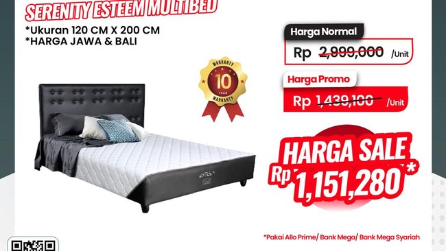 Berikutnya, untuk Serenity Esteem Multibed ukuran 160x200 cm ditawarkan dengan harga promo Rp 1.889.100 dari harga normal Rp 3.999.000. Kemudian, produk ini ditawarkan dengan harga sale Rp 1.511.280. Harga ini berlaku untuk wilayah Jawa dan Bali.