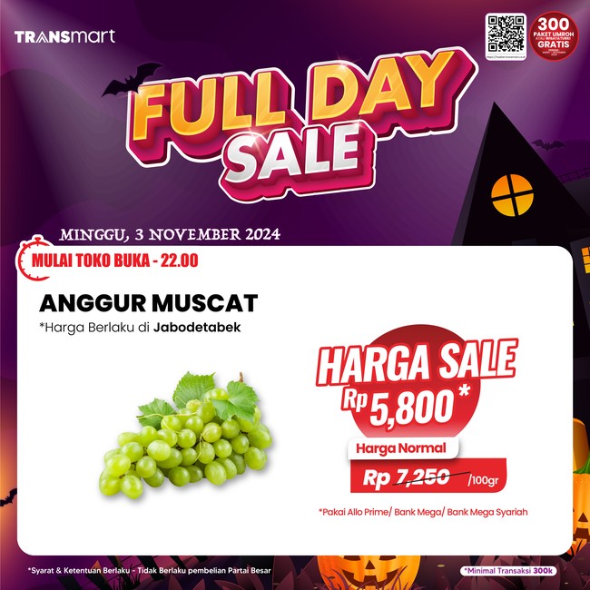 Selama gelaran Transmart Full Day Sale, ada diskon hingga 50+20% untuk berbagai produk seperti produk rumah tangga, furniture, elektronik, hingga sepeda listrik. Tambahan 20% bisa didapatkan jika melakukan pembayaran menggunakan Allo Prime, Kartu Kredit Bank Mega atau Bank Mega Syariah.