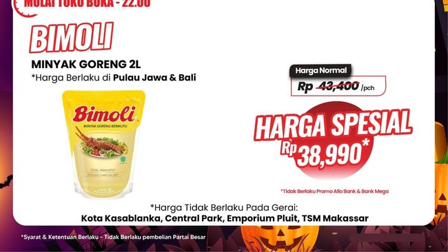 Khusus hari ini, minyak goreng merk Bimoli 2 liter ditawarkan dengan harga diskon Rp 38.990 dari harga awal Rp 43.400. Harga diskon di atas berlaku di Pulau Jawa dan Bali.