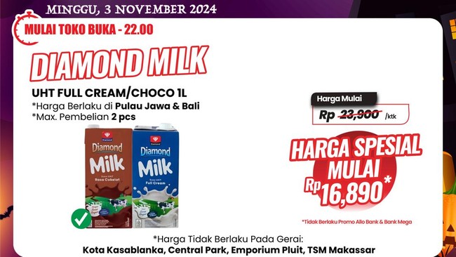 Susu UHT merek Diamond Milk dengan varian rasa coklat dan full cream ukuran 1 liter dijual dengan harga spesial Rp 16.890 dari harga awalnya Rp 23.900 per kotak.