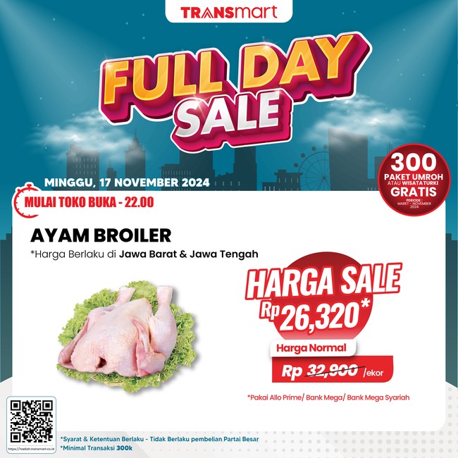 Di Transmart Full Day Sale Jabodetabek, ayam broiler diobral cuma Rp 28.400/ekor dari harga normal Rp 35.500/ekor. Harga itu bisa didapatkan jika melakukan pembayaran menggunakan Allo Prime, kartu kredit Bank Mega atau Bank Mega Syariah.