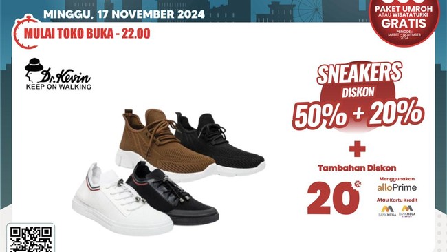 Sneakers Dr Kevin, Transmart Full Day Sale memberikan diskon 50%+20%. Pelanggan Transmart cukup membayar dengan Allo Prime, Kartu Kredit Bank Mega atau Bank Mega, kemudian akan mendapat tambahan diskon 20%.