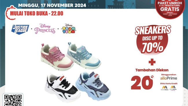 Aneka sneakers anak diskon 70%+20%, mulai dari merek Justice League, Disney Princess, hingga Disney Tsum Tsum. Masih dari merek yang sama, ada juga diskon untuk sandal anak. Diskon yang diberikan juga gede-gede yakni 70%+20%.