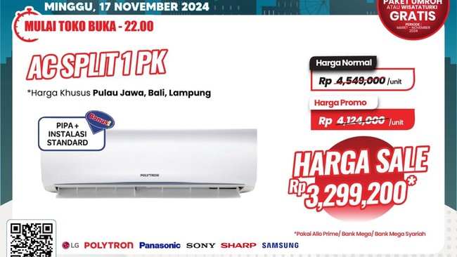 AC Split 1 PK ditawarkan dengan harga promo Rp 4.124.000 dari harga awal Rp 4.549.000. Makin murah menggunakan Allo Prime, Kartu Kredit Bank Mega atau Bank Mega Syariah, jadi Rp 3.299.200.