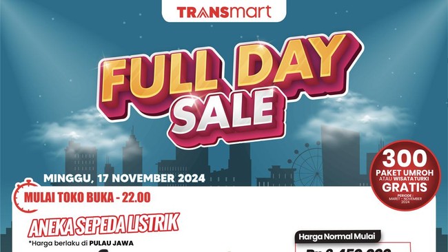 Promo Full Day Sale hanya berlangsung hari ini di seluruh gerai Transmart se-Indonesia mulai buka toko hingga pukul 22.00 waktu setempat. Tak ketinggalan di luar Pulau Jawa juga mendapatkan harga spesial.