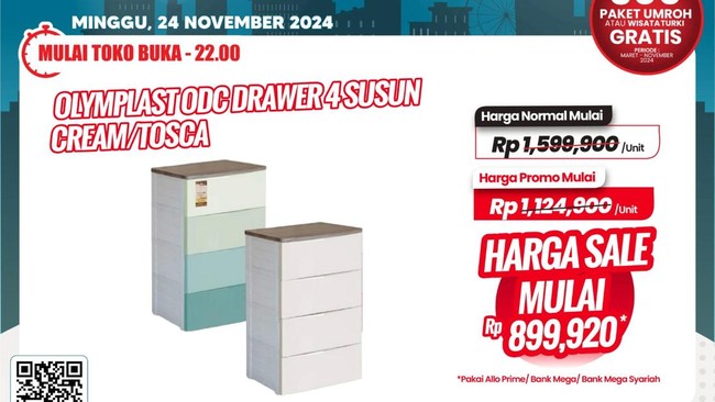 Salah satunya produk Olymplast ODC Drawer 4 Susun Cream/Tosca. Produk ini dijual dengan harga spesial mulai dari Rp 1.124.900/unit, dari harga normal mulai dari Rp 1.599.000/unit.