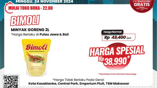 Ada pula diskon Bimoli Minyak Goreng 2 Liter turun harga jadi Rp 38.990 dari harga normal Rp 43.400, dan Oatside Caps jadi seharga Rp 6.900 dari harga normal Rp 8.900. Juga diskon Indomie Mie Goreng Special 85gr/Ayam Bawang 69gr/Soto Mie 70gr/Kari Ayam 72gr beli 5 bungkus seharga Rp 13.490 dari harga normal Rp 3.100 per bungkus.